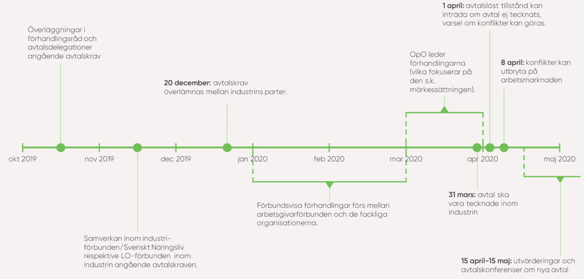Den 31 mars 2020 skulle huvuddelen av kollektivavtalen i Sverige ha löpt ut efter en treårig avtalsperiod. Detta påbörjades men pausades, med prolongerade avtal till följd, med anledning av coronakrisen.