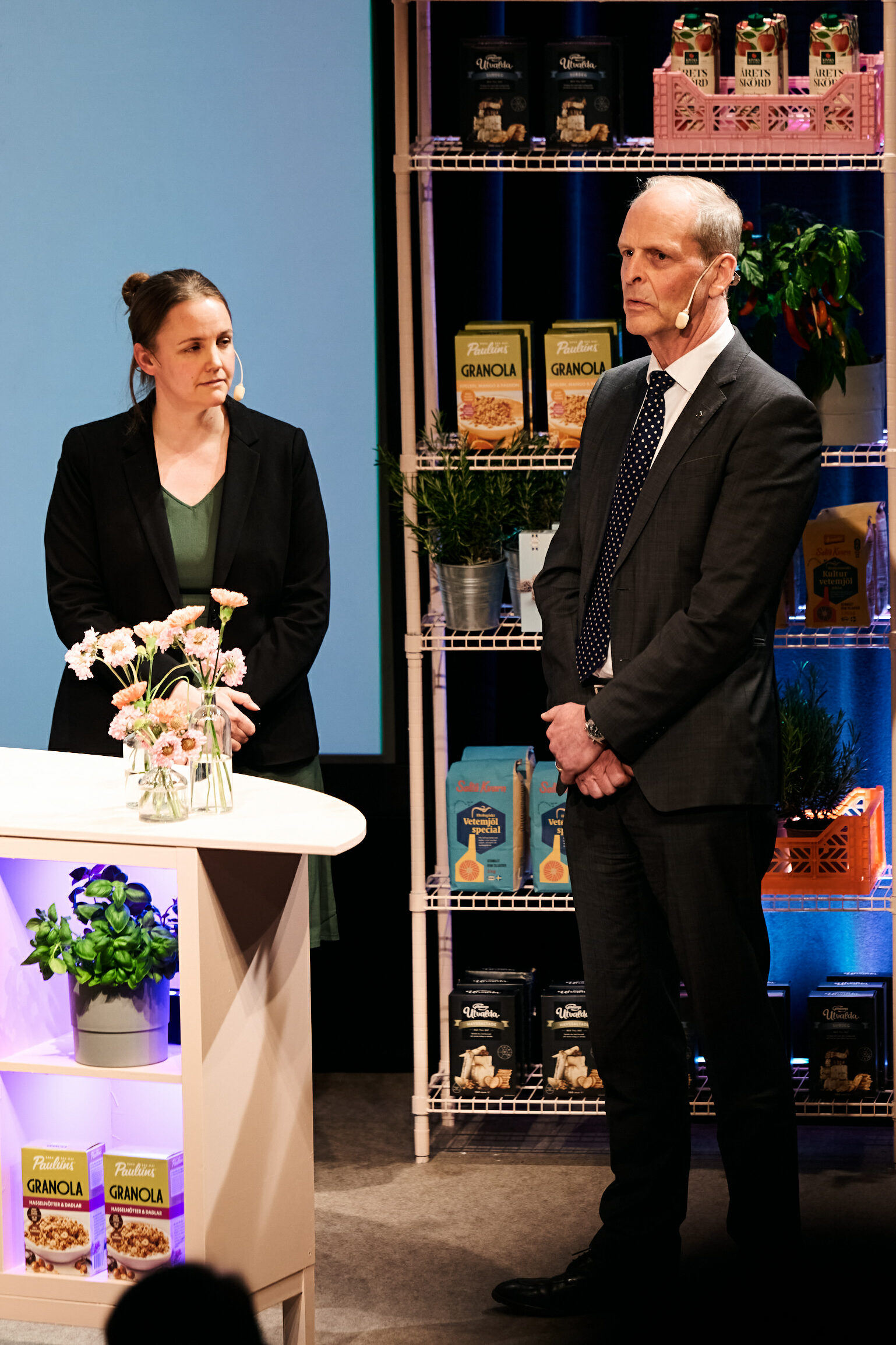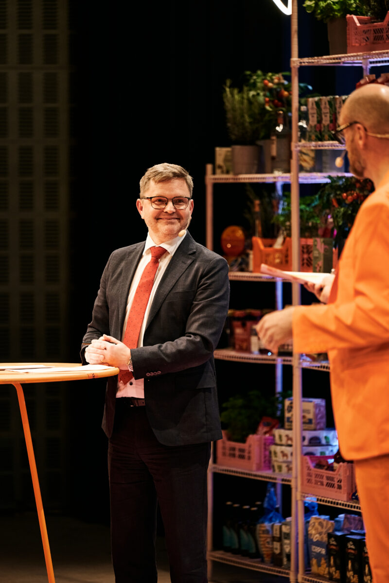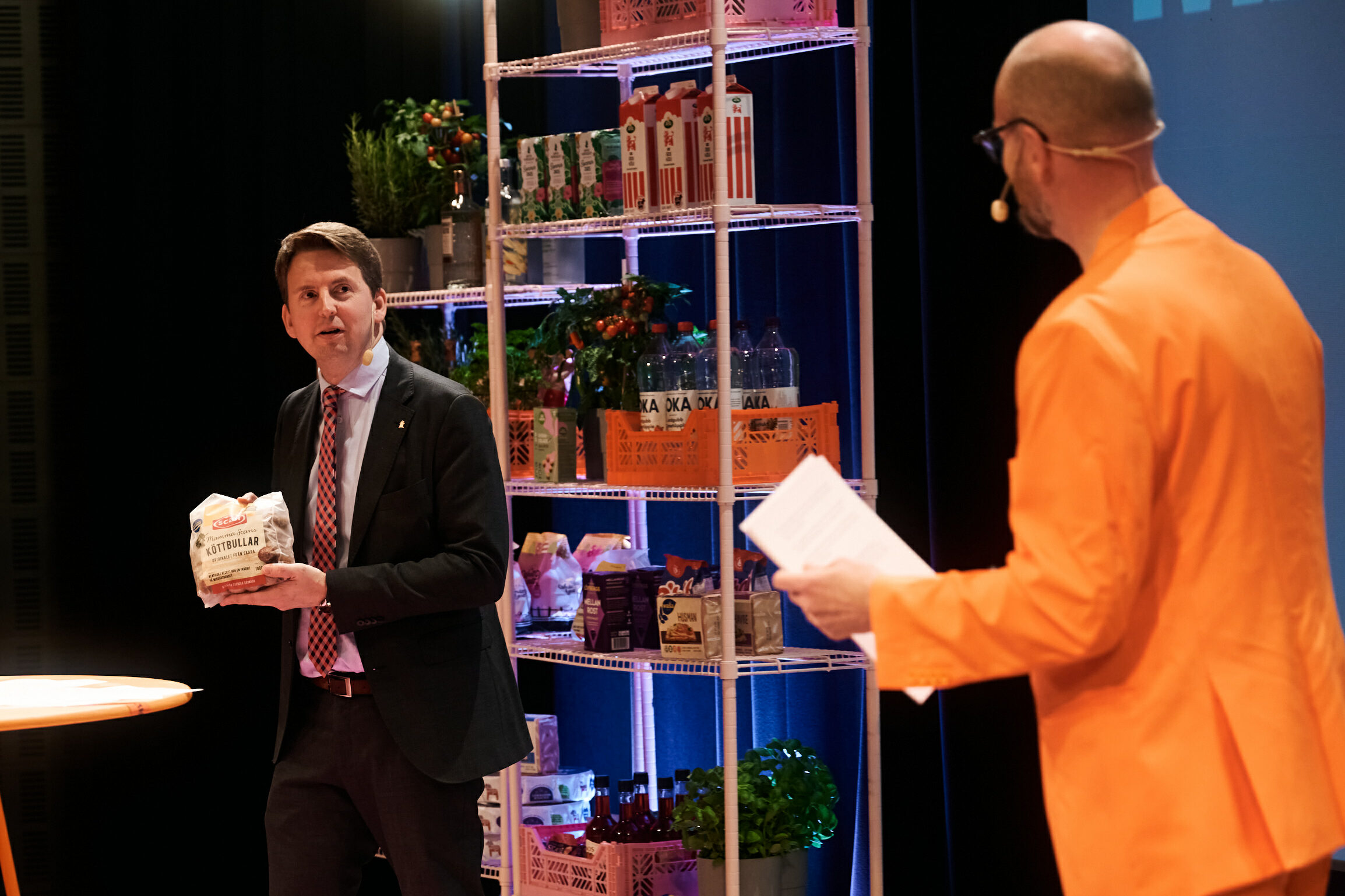 Sofie Eliasson Morsink, Livsmedelsföretagens ordförande, hälsade välkommen.Dagens moderator Daniel Emilson, presschef på Livsmedelsföretagen, hade klätt upp sig dagen till ära. Daniel Liljeberg, statssekreterare hos landsbygdsminister Peter Kullgren, presenterade den uppdaterade livsmedelsstrategin och frågades ut av moderator Daniel Emilson.
