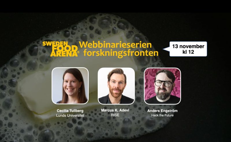 I november är det premiär för Sweden Food Arenas nya direktsända webbinarieserie ”Forskningsfronten”. Ett lättsmält format där du viger en halvtimme av din lunchpaus åt att lära dig mer om spännande innovationsområden i matsystemet. I ett avsnitt av Forskningsfronten bjuds du på en kortare spaning och därefter ett samtal med två inbjudna forskare som har koll på ämnet. Det här är ett bra tillfälle för livsmedelsföretag att inspireras till produktutveckling och att engagera sig i framtida forskning