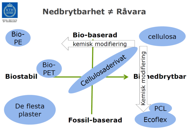 Ulrika Edlund från KTH rätade ut alla frågetecken om vad plast är och förklarade begreppen biobaserat och bionedbrytbar på ett bra sätt (se bilden nedan) vilket var väldigt nyttigt att ha med sig under resten av dagen. Enligt Ulrika är möjligheterna med biobaserad plast att vi kan fasa ut den fossila råvaran och få ”cirkulärt kol”. Men det finns också utmaningar så som etisk markanvändning, gröna processer och egenskaper i avfallshanteringen.