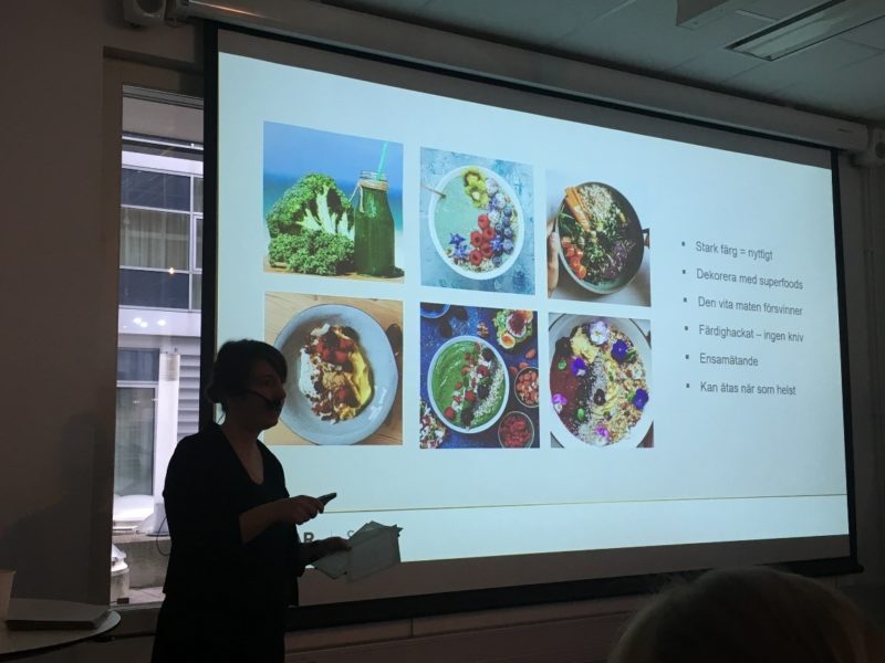 Därefter handlade det om bildspråket i sociala medier. De som engagerar sig är framför allt kvinnor. Det påverkar hur samtalet förs och hur bilderna ser ut. Hälsosam kost ser ut som bowls, färgsprakande och maximalistiskt. Bowls-trenden dominerar framförallt på Instagram; ju mer färg desto nyttigare! Och de är ofta dekorerade med olika superfoods. Det visar också tydligt vad det är som är borta – den vita maten socker, pasta och mjölk. Det är skivat, färdighackat och förberett men inte processat. Man ser inget runt omkring, inga bestick eller i vilket sammanhang maten serveras, så hur man äter dessa bowls och med vem framgår inte. Vad vill man då säga med den här maten som ser ut som en regnbåge eller en blomsteräng?