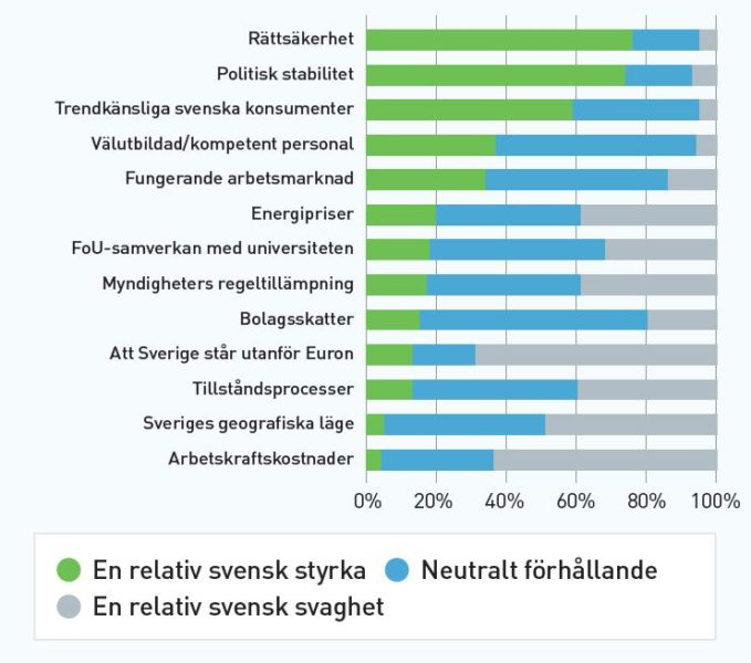 Livsmedelsföretagen har bett medlemsföretagen att gradera Sveriges internationella position utifrån 13 olika variabler. Enligt företagen är Sveriges fem största styrkor följande (procentsiffran anger hur många som svarat att variabeln är en styrka jämfört med konkurrentländerna):