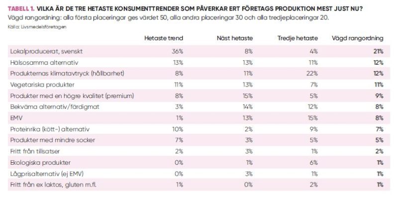 Sedan 2014 har Livsmedelsföretagen frågat medlemsföretagen vilka konsumenttrender som påverkar företagens verksamhetsvillkor allra mest. Den viktigaste trenden från de senaste tre åren är fortsatt ohotad, nämligen lokalproducerat. För de flesta konsumenter är lokalproducerat i praktiken detsamma som svenskproducerat.