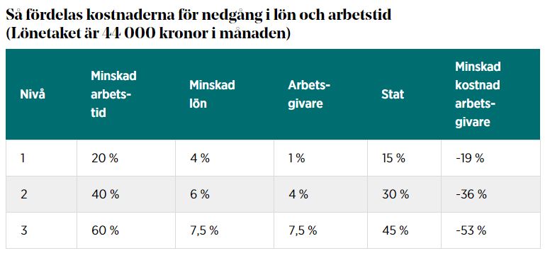Det finns tre fasta nivåer för arbetstidsminskning: 20, 40 eller 60 procent som innebär minskade kostnader med 19, 36 respektive 53 procent för arbetsgivaren i de tre olika fallen. Det är endast vid arbetstidsminskning inom dessa nivåer som stöd för korttidspermitteringen gäller.