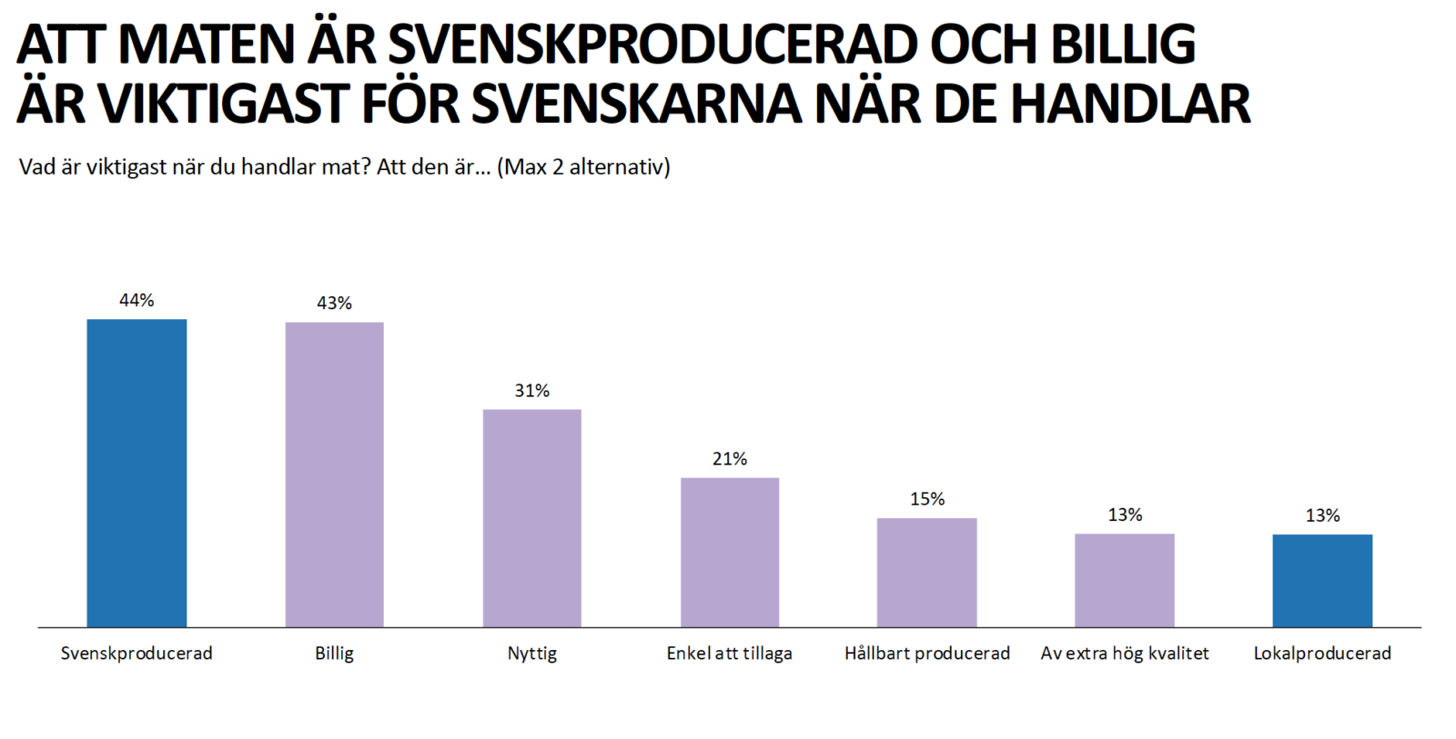 Vad tycker då svenskarna är viktigast när man handlar mat? Tredje viktigast enligt Livsmedelsföretagens undersökning är att maten är nyttig, och näst viktigast att den är billig. På förstaplats hamnar att maten är svenskproducerad, och om man dessutom slår ihop alternativen svenskproducerat och lokalproducerat så blir det väldigt tydligt vad svenskar tycker är viktigast.