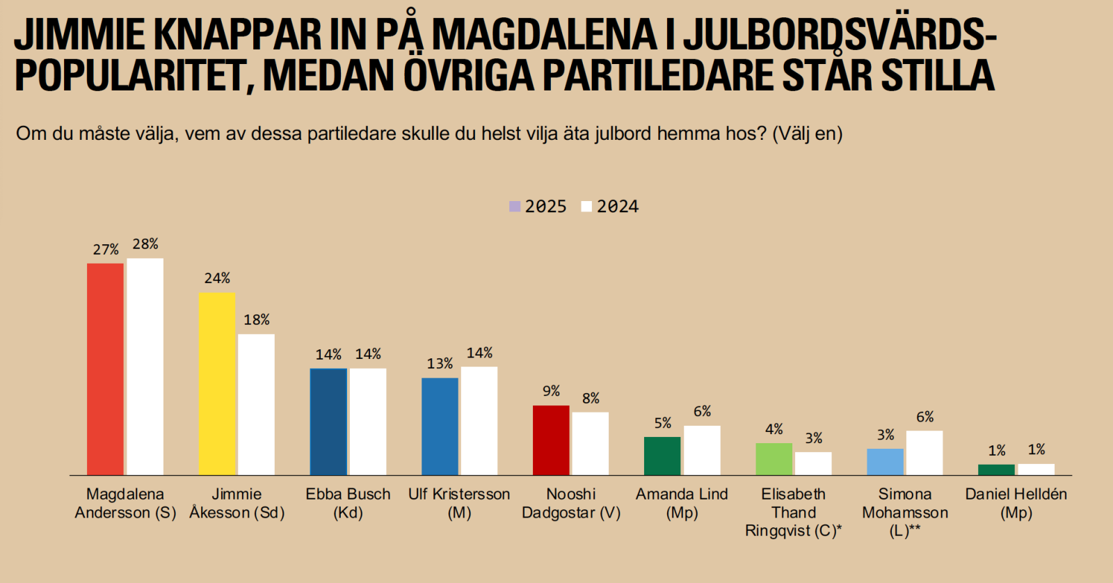 Bransch- och arbetsgivarorganisationen Livsmedelsföretagen har som en del av sin stora julmatsundersökning via Demoskop frågat 1006 svenskar vilken partiledare de helst vill äta julbord hos. Årets favoritvärd är Magdalena Andersson (S) med 27 procent av rösterna. Jimmie Åkesson (SD) ökar hela sex procentenheter jämfört med 2024 och tar andraplatsen med 24 procent. Ebba Busch (KD) behåller sina 14 procent och går därmed om statsminister Ulf Kristersson (M) som med 13 procent får nöja sig med fjärdeplatsen i julbordsundersökningen.
