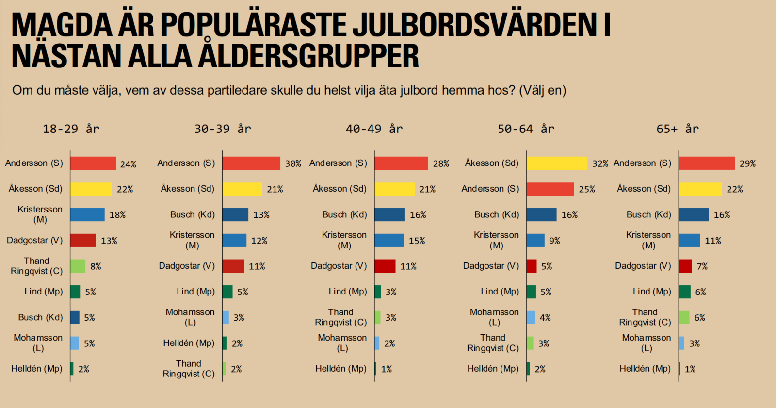 Magdalena Andersson (S) är svenskarnas julbordsfavorit i samtliga ålderskategorier förutom i gruppen 50-64 år, där Jimmie Åkesson (SD) är mest populär. Bryter man ner undersökningen på könstillhörighet syns tydliga skillnader. Bland kvinnor är Magdalena Andersson (S) överlägset mest populär med 34 procent av rösterna, medan hon bland män får nöja sig med 20 procent. Populärast som julbordsvärd bland männen är Jimmie Åkesson (SD) med 28 procent. Men det är inte så enkelt som att män föredrar män och kvinnor kvinnor. Ebba Busch (KD) till exempel är nästan dubbelt så populär bland män (18 procent) som hos kvinnor (10 procent).