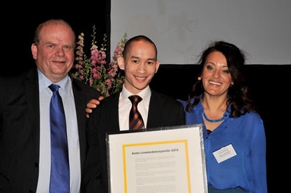 Nyåkers VD Christoffer Öhberg tar emot priset av landsbygdsminister Eskil Erlandsson på Livsmedelsföretagens matdag i dag.