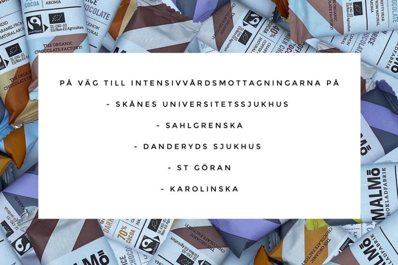 Så här skriver Malmö Chokladfabrik på sin Instagram-sida: ”Personalen på våra intensivvårdsavdelningar runt om i Sverige (och kanske allra mest i storstäderna) sliter dag och natt just nu med att ta hand om alla Corona-fall och vi, likt alla andra, vill såklart visa vårt stöd för dem i denna påfrestande tid. Därför gick ett par hundra Malmöbars just iväg till respektive av de fem berörda sjukhusen och vi hoppas det gör tillvaron något drägligare för våra hjältar i frontlinjen. Ingen kan göra allt, men alla kan göra något.”