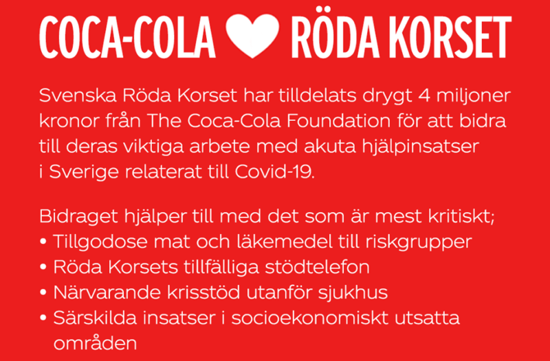 Svenska Röda Korset har tilldelats drygt fyra miljoner kronor från The Coca-Cola Foundation som ska gå till akuta hjälpinsatser i Sverige relaterat till covid-19 för att kunna hjälpa med det som är mest kritiskt. Coca-Cola beslutade tidigt att tills vidare pausa all annonsering i media för Coca-Cola och alla sina andra varumärken. Dessa pengar går istället till Röda Korsets nationella arbete som bland annat inkluderar att stötta kommuner och regioner att tillgodose mat och läkemedel till riskgrupper, Röda Korsets tillfälliga stödtelefon, digitala läxhjälp, närvarande krisstöd utanför sjukhus och särskilda insatser i socioekonomiskt utsatta områden under coronakrisen.