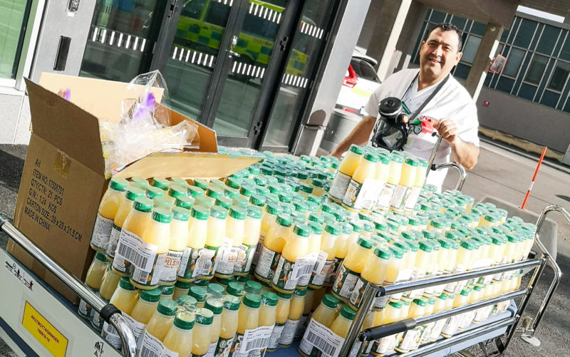 Flera anställda på Stockholmskontoret har åkt ut med juice till bland annat Karolinska Universitetssjukhuset, Danderyds Sjukhus och det nya fältsjukhuset på Stockholmsmässan i Älvsjö.