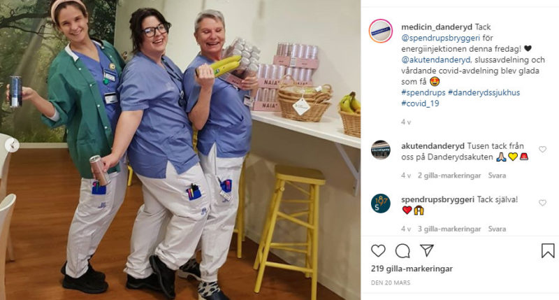 Spendrups har bidragit till att boosta vårdpersonal genom att donera bland annat Loka-vatten och skyddskläder. Nästan dagligen går leveranser till akutsjukhus, äldreboenden och ambulanspersonal. Men framförallt är det energidrycken Naia som blivit det mest drivande varumärket i bryggerijättens initiativ. På Instagram flödar tacksamheten när trötta kroppar får en välbehövlig injektion av vatten, koffein och vitaminer.