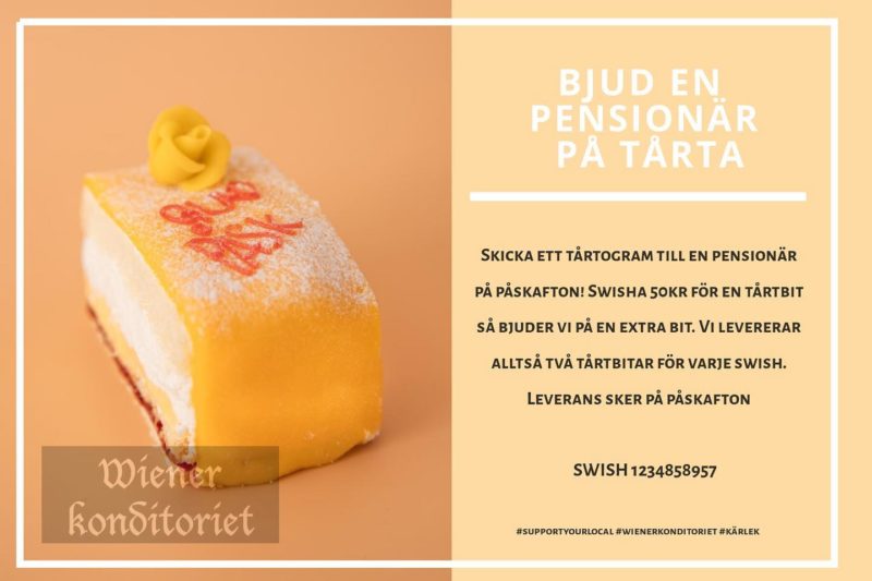 Wienerkonditoriet i Jönköping villa stötta riskgruppernas karantänvistelse och initierade möjligheten att skicka ett ”tårtogram” till äldreboenden på påskafton. Genom att swisha 50 kronor för en bit bjöd Wienerkonditoriet på en bit extra och levererade godsakerna. 140 tårtbitar blev det innan konditoriet behövde stänga slussarna för att hinna med.