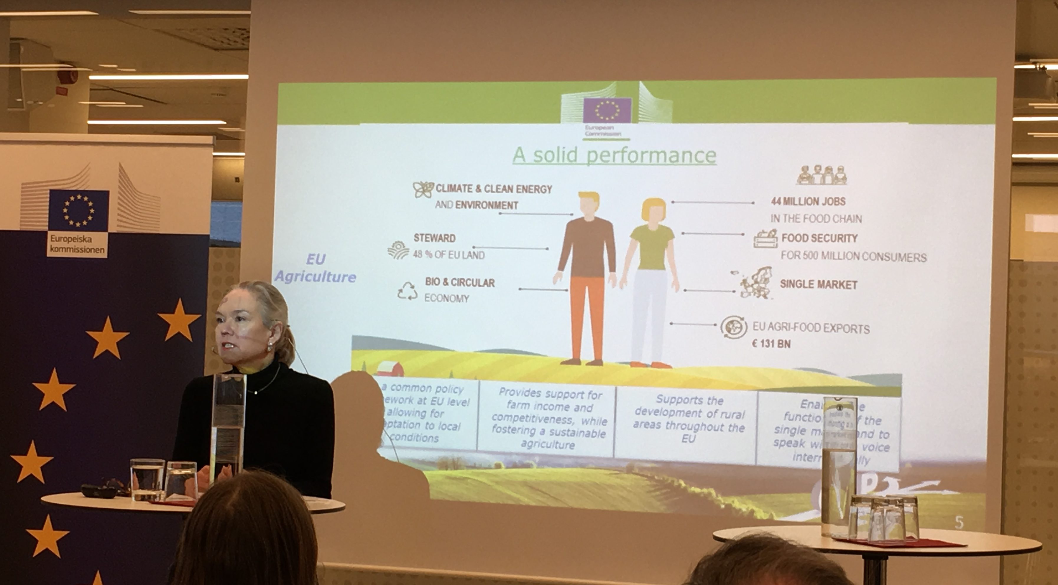 Helena Vangby från DG-Agri presenterade innehållet i det meddelande som Kommissionen skickat ut. Hälften av EU:s befolkning bor på landsbygden och bönderna förvaltar 48% av marken i EU. Jordbruket ger upphov till 22 miljoner arbetstillfällen och räknar man med livsmedelsindustrin och handeln så blir det totalt 44 miljoner arbetstillfällen. EU har även satsat på export och 2017 var ett rekordår då livsmedelsexporten från EU för första gången var större än importen. Jordbrukssektorn konkurrerar på världsmarknaden men kämpar också med låg lönsamhet, delvis p.g.a. EU:s höga produktionsstandarder.