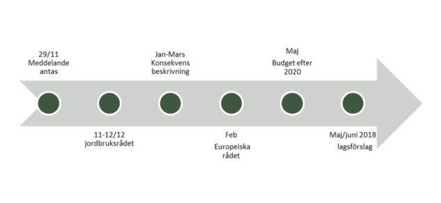 Tom Tynan tryckte på att man skall se de kommande förändringarna i jordbrukspolitiken som en evolution och inte en revolution. Jordbrukspolitiken skall bli mål- och resultatstyrd och skall bygga mer på närhetsprincipen. Fredagen 23/2 skulle det första informella mötet om EU:s budget från 2020 och framåt äga rum. Jordbrukspolitiken är den största posten i EU:s budget så det är utan några överdrifter en oerhört viktig fråga. I grafiken här nedanför framgår tidplanen för den nya gemensamma jordbrukspolitiken CAP (Common Agriculture Policy).