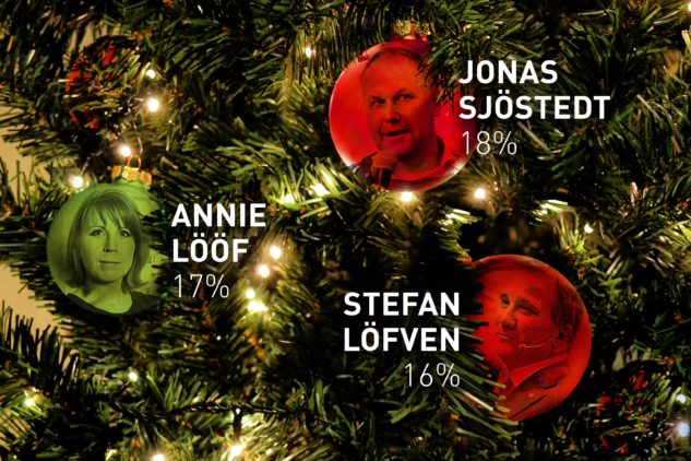 På första plats med 18% hamnar Vänsterpartiets Jonas Sjöstedt, tätt följd av Centerpartiets Annie Lööf med 17%. På tredje plats kommer Socialdemokraternas Stefan Löfven – 16% av svenskarna vill bli bjudna på julbord hos statsministern på Sagerska palatset. Med bara 4% av rösterna vardera hamnar Miljöpartiets språkrör Isabella Lövin och Gustav Fridolin precis på julbordsspärren.