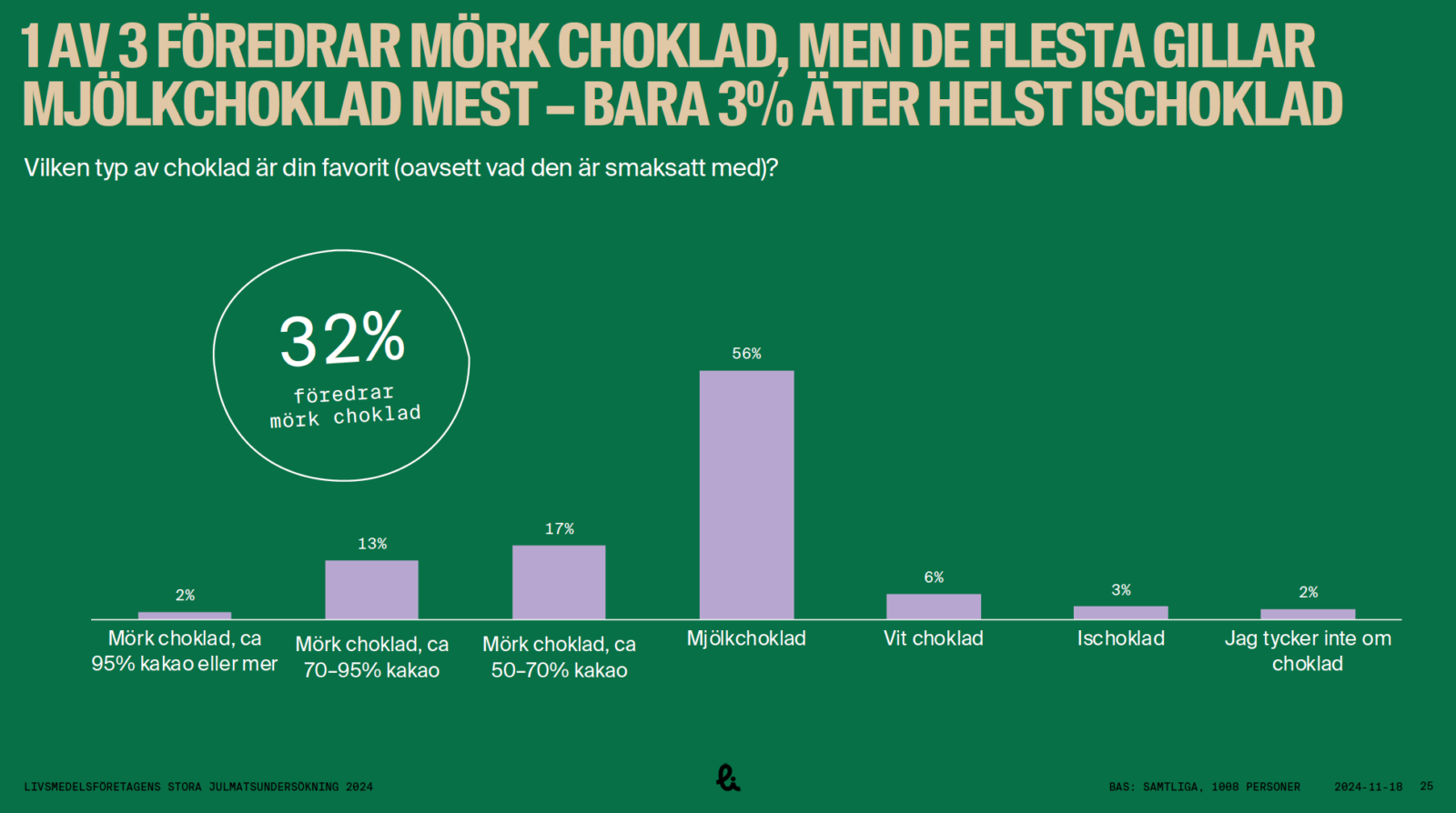 Tredjeplatsen på julgodislistan intas av den i julsammanhang närmast obligatoriska chokladasken som med dess olika smaker och sorter har något för nästan alla. På tal om choklad så har Livsmedelsföretagen även frågat svenskarna vilken som är deras favoritvariant, och överlägsen vinnare med 56 procent är mjölkchokladen. På en avlägsen andraplats med 17 procent av rösterna kommer mörk choklad med en kakaohalt på 50–70 procent. Tredjeplatsen intas av mörk choklad med 70–95 procents kakaohalt. Vill du ha chokladen för dig själv gör du klokt i att föredra choklad med mer än 95 procents kakaohalt – den har bara två procent av svenskarna som sin favorit. Martin Isaksson, chefskonditor och VD för Chokladfabriken, är inte förvånad över att mjölkchokladen toppar listan.