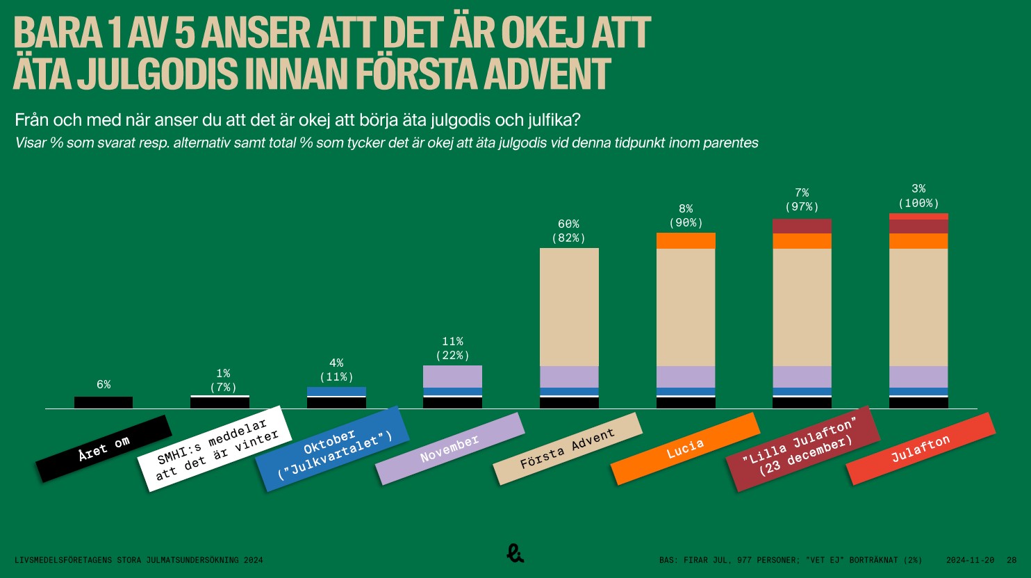 – Det är spännande att grotta i kalendermässiga röda julskynken. Under de senaste åren har vi djupdykt i allt från när det är ok att börja spela julmusik till när den första julölen får knäckas till när glögg första gången får värmas på. Faktum är att det råder en ganska samstämmig bild över när julens fundamenta får tas i bruk. Och även om livsmedelsproducenterna hade varit betjänta av ett ”julkvartal” för att undvika röda siffror så tycker en majoritet av svenskarna att man åtminstone bör hålla sig till första advent innan man smakar, dricker och lyssnar in julen, säger Jimmy Sandell, kommunikations- och näringspolitisk chef på Livsmedelsföretagen.