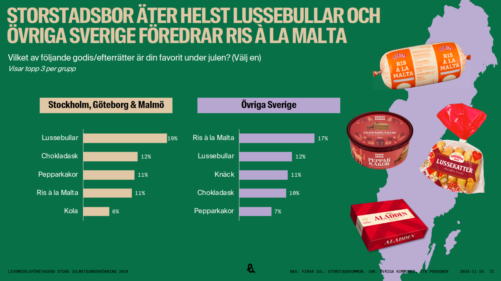 Lussebullens ökande popularitet verkar dessutom vara ett storstadsfenomen. Boende i Stockholm, Göteborg och Malmö har lussebullen som sin julfavorit, medan övriga landet föredrar Ris à la Malta.