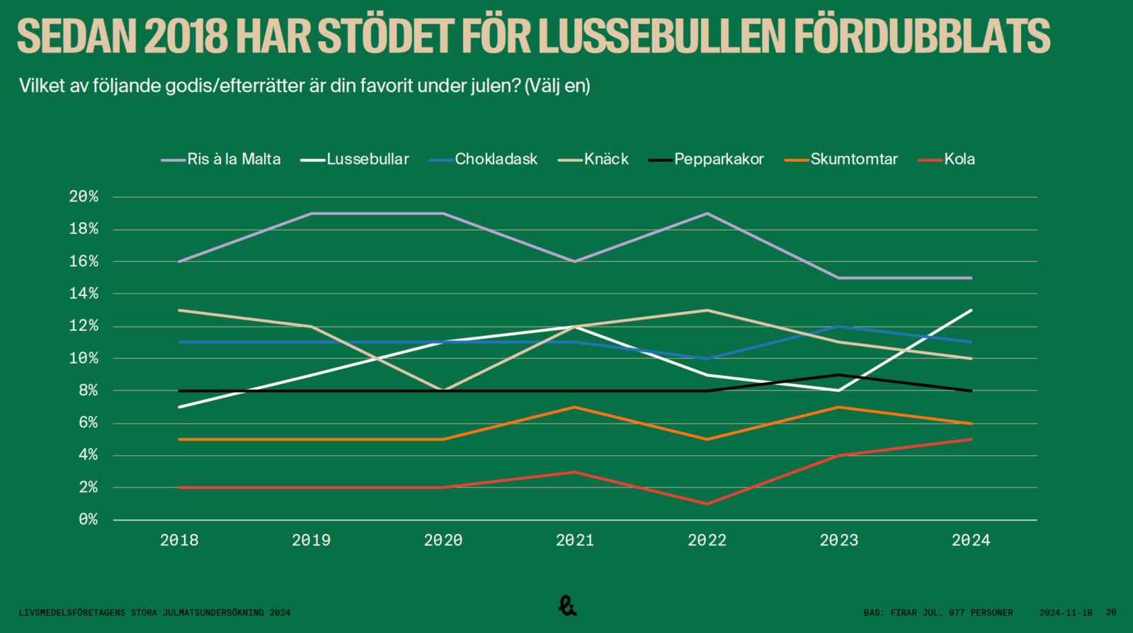 Inget julbord utan julgodis! I årets julundersökning har Livsmedelsföretagen gjort en djupdykning i svenskarnas preferenser kring julgodis- och efterrätter. Största favoriten för sjunde året i rad är klassikern Ris à la Malta som 15 procent av svenskarna bara måste ha på julbordet. Frågan är dock om det är ett tronskifte på gång? På en nära andraplats kommer lussebullen, som i år ökar hela fem procentenheter från åtta till 13 procent.