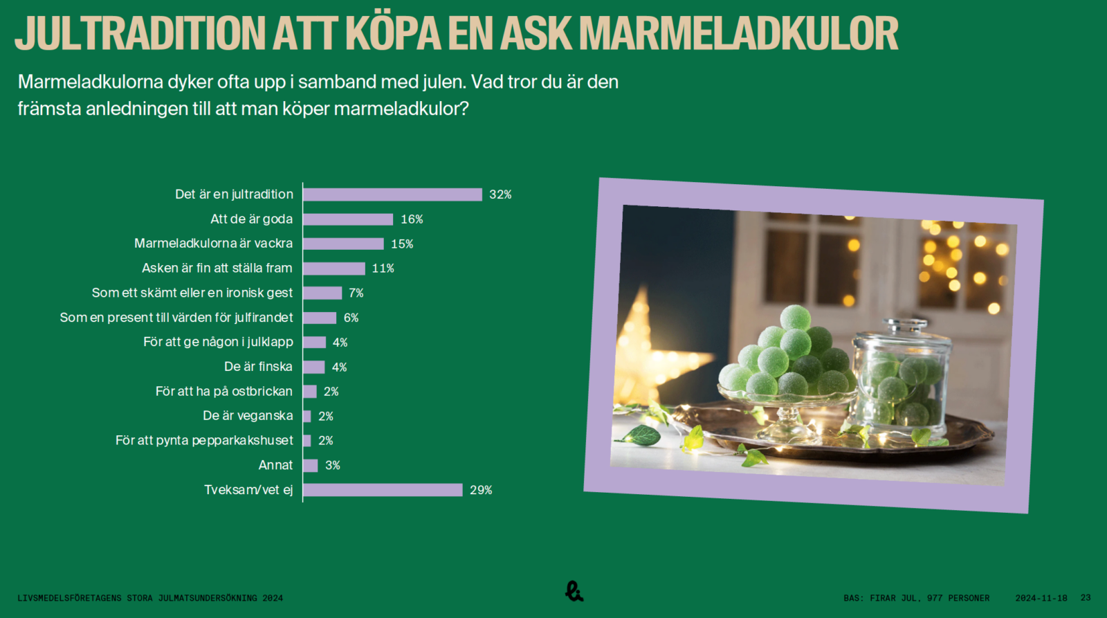 En vanlig syn på många svenska konfektbord är den gröna marmeladkulan, och med sitt unika utseende sticker den onekligen ut i julgodissortimentet. Vi frågade svenskarna vad de tror är den främsta anledningen att man köper marmeladkulor. Ungefär en tredjedel svarade att ”det är en jultradition”, och drygt en sjättedel svarade helt enkelt att ”de är goda”. 15 procent svarade ”marmeladkulorna är vackra”, medan bara två procent köper dem för att dekorera pepparkakshuset.