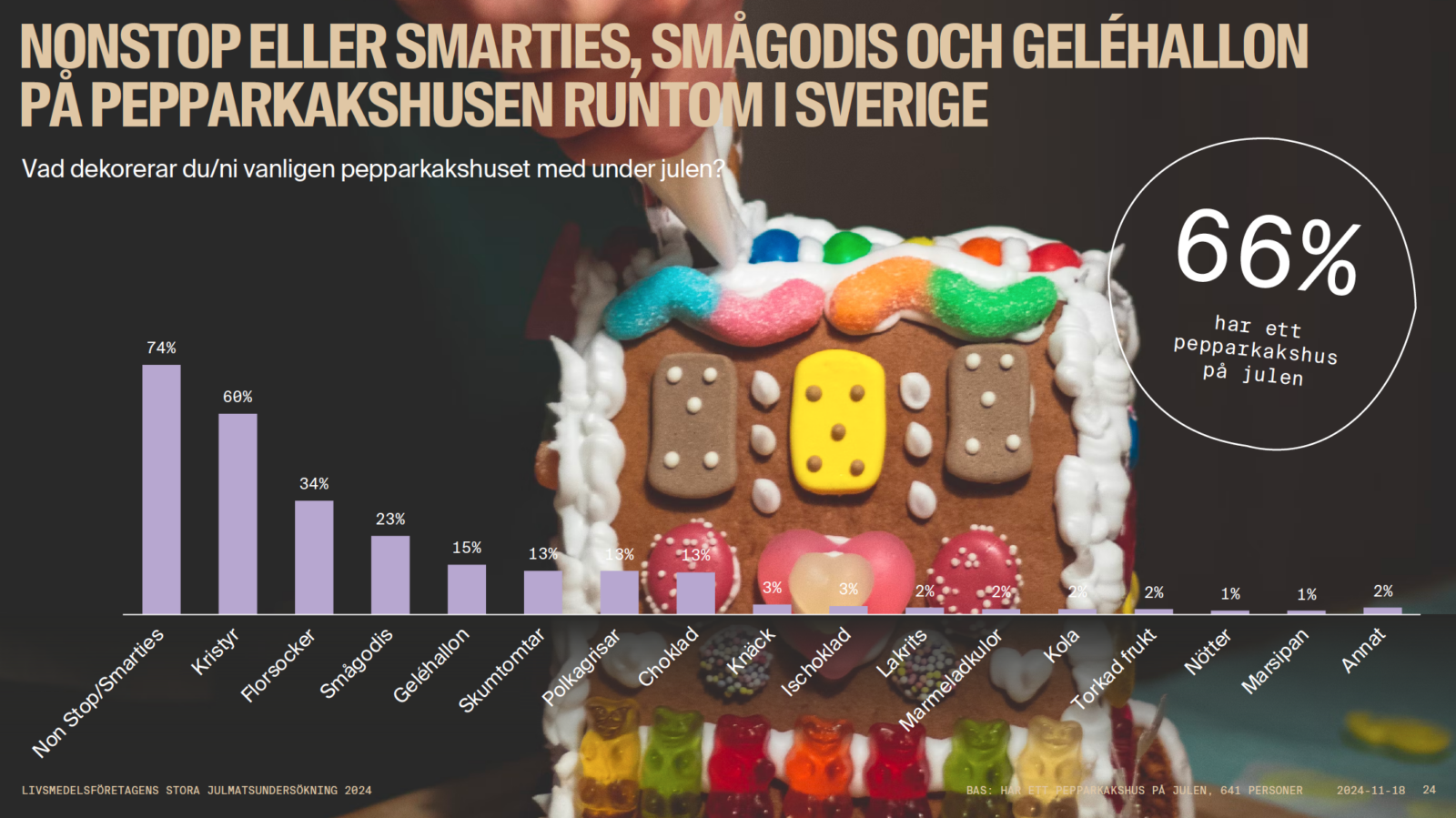 Det traditionella byggandet av pepparkakshus är något som många småbarnsföräldrar ser fram emot med skräckblandad förtjusning. Men vad dekorerar vi svenskar våra pepparkakshus med? Den allra vanligaste dekorationen är Non Stop/Smarties, följt av kristyr, florsocker, smågodis och geléhallon. Men långt ifrån alla bygger pepparkakshus – 33 procent av svenskarna har faktiskt aldrig pepparkakshus på julen.