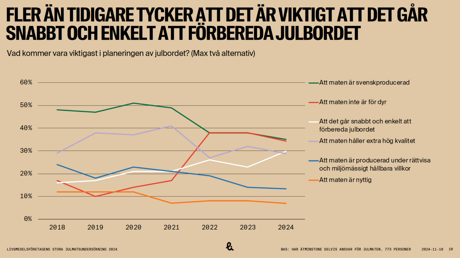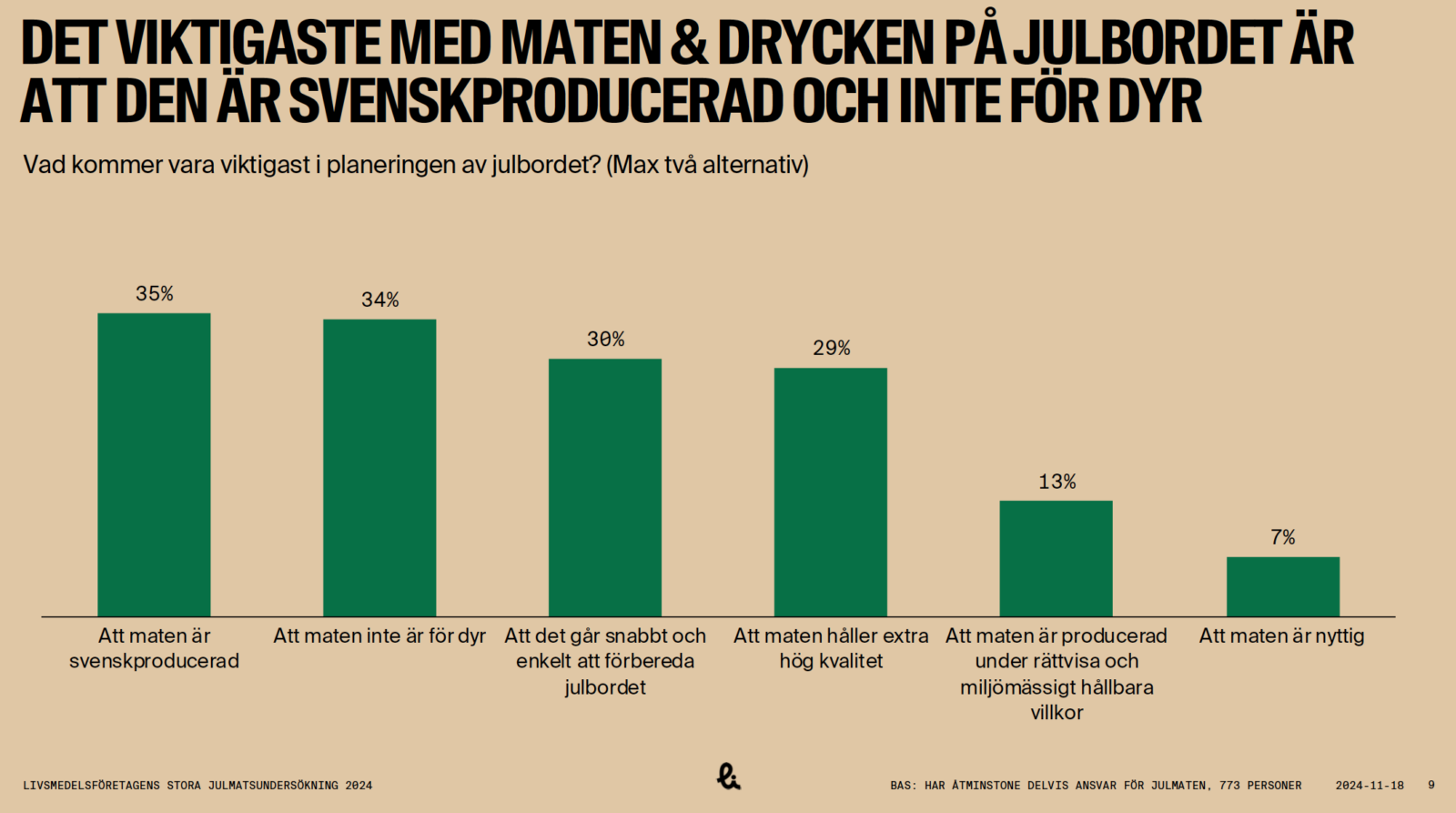På frågan om vad som är viktigast i planeringen av julbordet hamnar svarsalternativet ”att maten är svenskproducerad” i topp. Alternativet ”att maten inte är för dyr” kommer på en nära andraplats, men för första gången sedan 2021 tappar prisfaktorn i betydelse. Jimmy Sandell, kommunikations- och näringspolitisk chef på Livsmedelsföretagen, tolkar detta som att inflationen börjar släppa greppet om svenskarnas plånböcker.