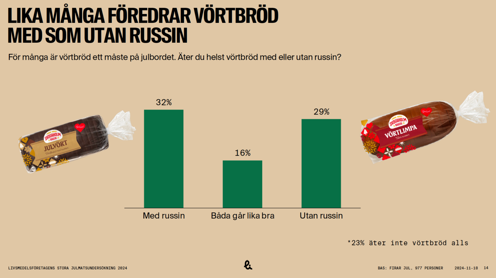 En traditionell produkt på det svenska julbordet är vörtbrödet. Det mörka, saftiga brödet utgör samtidigt något av en vattendelare – ska det vara med eller utan russin? 32 procent av det svenska folket anser att det ska vara med russin, medan 29 procent svarar utan. 16 procent säger att det går lika bra med som utan.