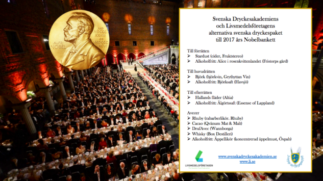 Nobelbanketten på Stadshuset i Stockholm är Sveriges främsta gastronomiska skyltfönster mot världen. Maten som serveras är gjord på svenska råvaror, men dryckerna är oftast utländska. Svenska Dryckesakademien har i samarbete med Livsmedelsföretagen tagit fram ett alternativt svenskt dryckespaket till Sveriges mest högtidliga fest.