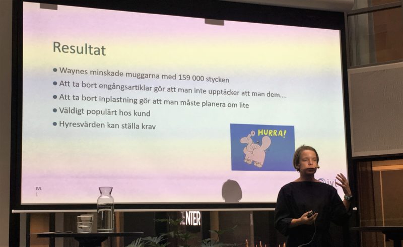 Waynes har tagit bort vissa plastartiklar på den s.k. sockerstationen. När man tog bort viss inplastning av vissa produkter så ökade matsvinnet, och därmed krävdes lite ändring i planeringen för att undvika detta. Initiativet var populärt hos kunderna som uppskattade att någon tar ansvar. Detta ger kundlojalitet. Fördelarna var att det var enkelt, kunderna har inte efterfrågat bestick etc. Hyresvärden har verkligen möjlighet att ställa krav. Vad händer nu? IVL söker pengar för att testa pantsystem för muggar och matlådor.
